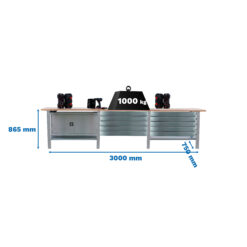 Banco de trabajo con tornillos y encimera de haya laminada, y cuentan con estantes inferiores que tienen una capacidad de carga de 300 kgs aportándole mucha resistencia al banco de trabajo. Cuenta con 10 cajones metálicos con guías telescópicas para una mayor facilidad de uso, y una armario metálico para guardar herramientas y accesorios, con una capacidad de carga de 50 kgs. Se tienen que poner el armario y el cajón en estructuras diferentes del banco de trabajo. La encimera de haya laminada de 32 mm de espesor que aguanta mejor el impacto y los golpes. Es de color GRIS. Las dimensiones de este banco de trabajo son: 865x3000x750 mm. La encimera principal tiene una capacidad de carga en estático de 1000 kgs de forma uniformemente repartida por la superficie. Está fabricado en España y se monta fácil siguiendo las instrucciones.