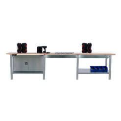 Banco de trabajo con tornillos y encimera de haya laminada, y cuentan con estantes inferiores que tienen una capacidad de carga de 300 kgs aportándole mucha resistencia al banco de trabajo. Cuenta con 2 cajones metálicos con guías telescópicas para una mayor facilidad de uso, y una armario metálico para guardar herramientas y accesorios, con una capacidad de carga de 50 kgs. Se tienen que poner el armario y el cajón en estructuras diferentes del banco de trabajo. La encimera de haya laminada de 32 mm de espesor que aguanta mejor el impacto y los golpes. Es de color GRIS. Las dimensiones de este banco de trabajo son: 865x3000x750 mm. La encimera principal tiene una capacidad de carga en estático de 1000 kgs de forma uniformemente repartida por la superficie. Está fabricado en España y se monta fácil siguiendo las instrucciones.