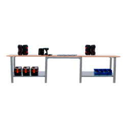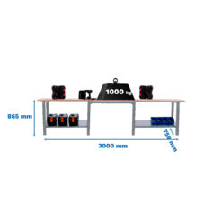 Banco de trabajo con tornillos y encimera de haya laminada, y cuentan con estantes inferiores que tienen una capacidad de carga de 300 kgs aportándole mucha resistencia al banco de trabajo. La encimera de haya laminada de 32 mm de espesor que aguanta mejor el impacto y los golpes. Es de color GRIS. Las dimensiones de este banco de trabajo son: 865x3000x750 mm. La encimera principal tiene una capacidad de carga en estático de 1000 kgs de forma uniformemente repartida por la superficie. Está fabricado en España y se monta fácil siguiendo las instrucciones.