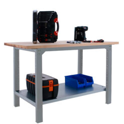 Banco de trabajo con tornillos y encimera de haya laminada, y cuenta con un estante inferior que tiene una capacidad de carga de 300 kgs aportándole mucha resistencia al banco de trabajo. La encimera de haya laminada de 32 mm de espesor que aguanta mejor el impacto y los golpes. Es de color GRIS. Las dimensiones de este banco de trabajo son: 865x1500x750 mm. La encimera principal tiene una capacidad de carga en estático de 1000 kgs de forma uniformemente repartida por la superficie. Está fabricado en España y se monta fácil siguiendo las instrucciones.