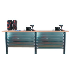 Banco de trabajo con tornillos y encimera de haya laminada, y cuentan con estantes inferiores que tienen una capacidad de carga de 300 kgs aportándole mucha resistencia al banco de trabajo. Cuenta con 10 cajones metálicos con guías telescópicas para una mayor facilidad de uso, pudiendo poner como máximo 5 cajones en una misma estructura. La encimera de haya laminada de 32 mm de espesor que aguanta mejor el impacto y los golpes. Es de color ANTRACITA. Las dimensiones de este banco de trabajo son: 8105x2600x750 mm. La encimera principal tiene una capacidad de carga en estático de 1000 kgs de forma uniformemente repartida por la superficie. Está fabricado en España y se monta fácil siguiendo las instrucciones.