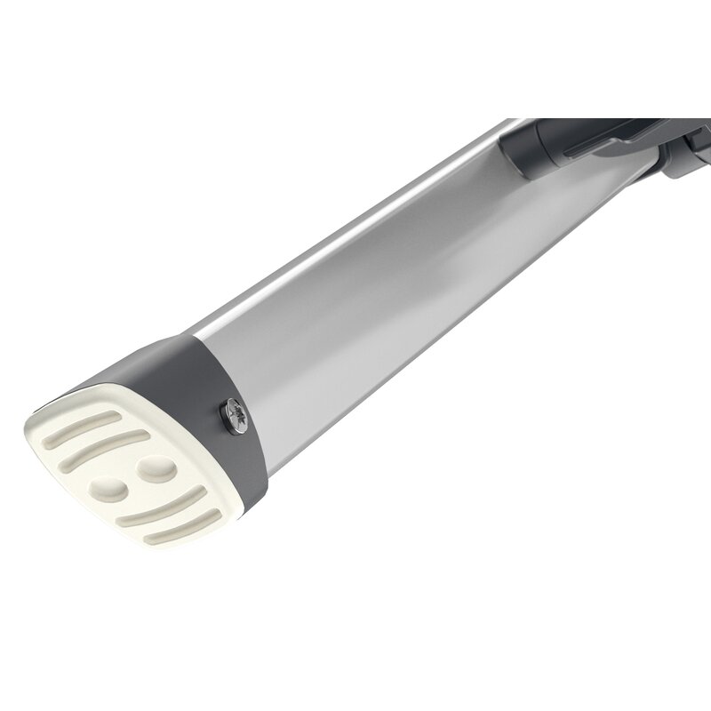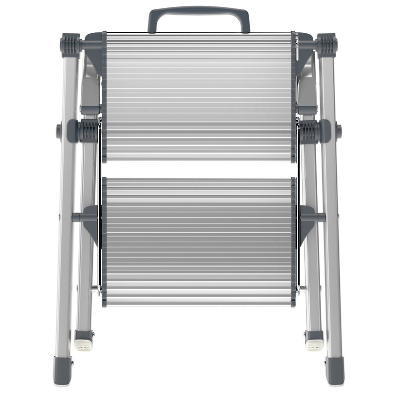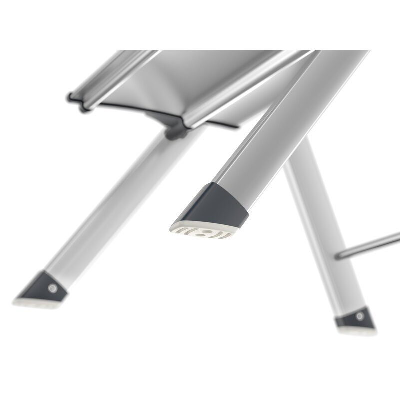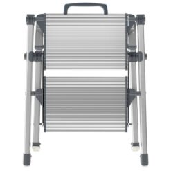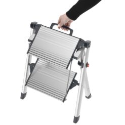 · Fácil de guardar: plegado sólo mide 6,5 cm de ancho. · Dos peldaños grandes de aluminio con ranuras antideslizantes para un óptimo confort al estar de pie. · Asa con función desbloqueante integrada. · Pies con tacos soft-grip para una óptima estabilidad y seguridad antideslizante en diferentes superficies, p. ej. parqué, moquetas y baldosas. · Resiste hasta 150 kg de carga.