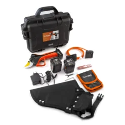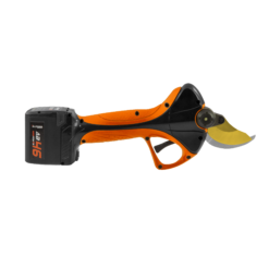 La tijera incluye dos baterías de litio de 25,2 V – 4,5 Ah, proporcionando autonomía suficiente para una jornada completa de trabajo. Gracias al cable de extensión, la batería puede llevarse en la funda o en el cinturón, reduciendo el peso en la mano y mejorando la ergonomía durante la poda.