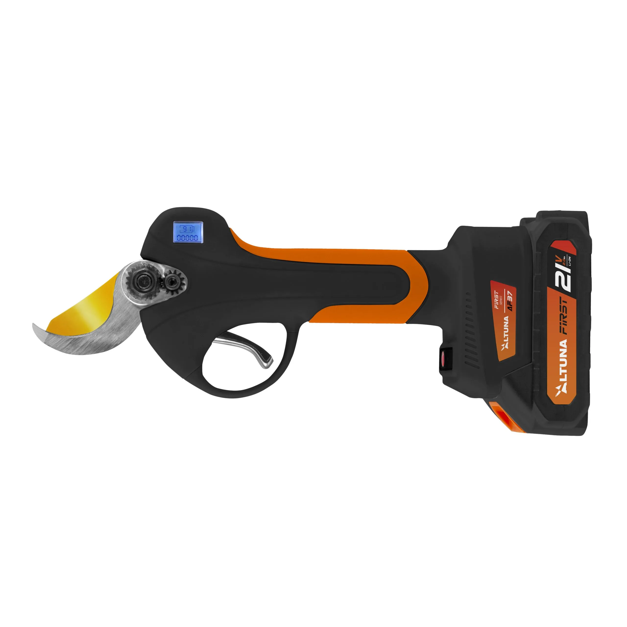 Tijera de poda a batería ALTUNA AF37, con doble apertura de corte de 19 y 37 mm, cuchilla de titanio, sistema anticorte de dedos y motor brushless con tecnología FASTCUTTING. Ideal para poda intensiva con máxima seguridad y precisión.