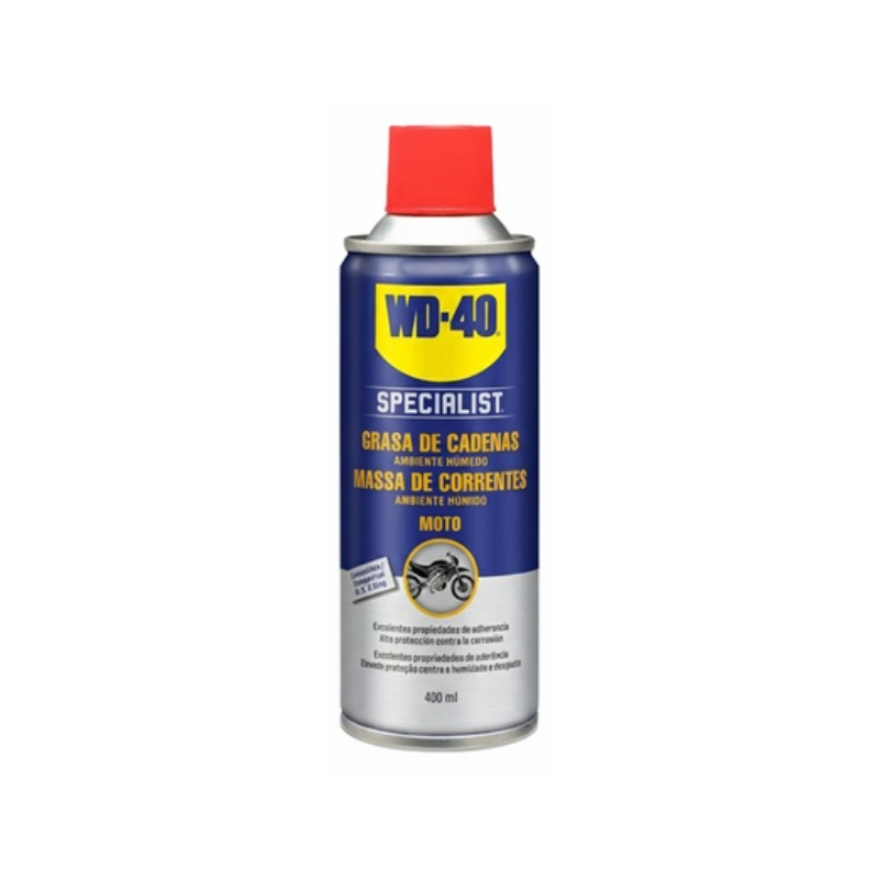 Grasa de cadenas WD-40 Specialist Moto 400 ml. Ideal para ambientes húmedos, con PTFE y alta protección contra desgaste.